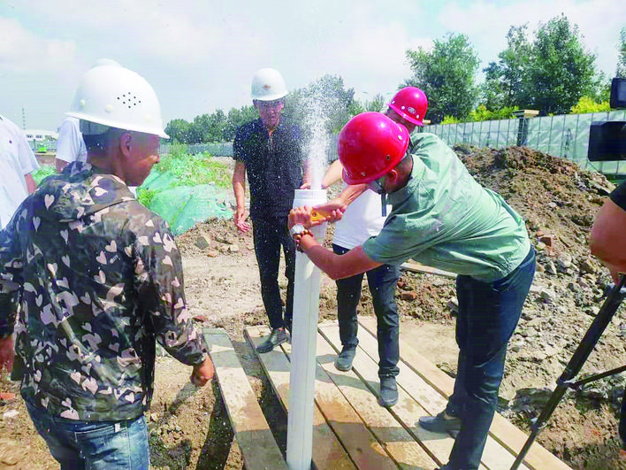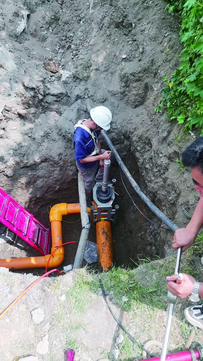 经开区观天下二期项目用水工程从报装到通水仅用了40分钟。图为工作人员打开水管阀门。“惊喜!”20日, 上午,在经开区观天下二期项目的工地.上,吉林富腾集团房地产开发有限责任公司总经理助理陈中秋看着水管里冒出的水流,高兴得合不拢嘴。
